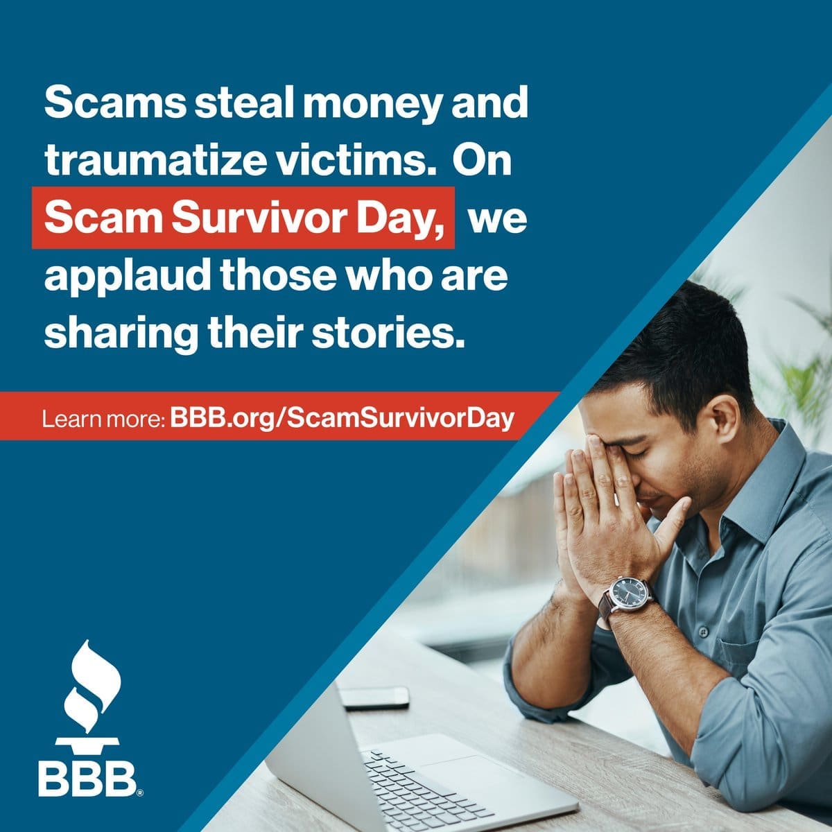 BBB Institute established the Scam Survivor Day Coalition, a collaboration of corporate and nonprofit organizations that care about consumers and work to champion the needs of scam survivors. BBB created National Scam Survivor Day in 2024, held on the second Thursday in May. We encourage communities to take part and uplift their neighbors through local events that recognize Scam Survivor Day, give survivors the opportunity for their voices to be heard, and combat the stigma that keeps them from seeking the guidance and assistance they deserve.